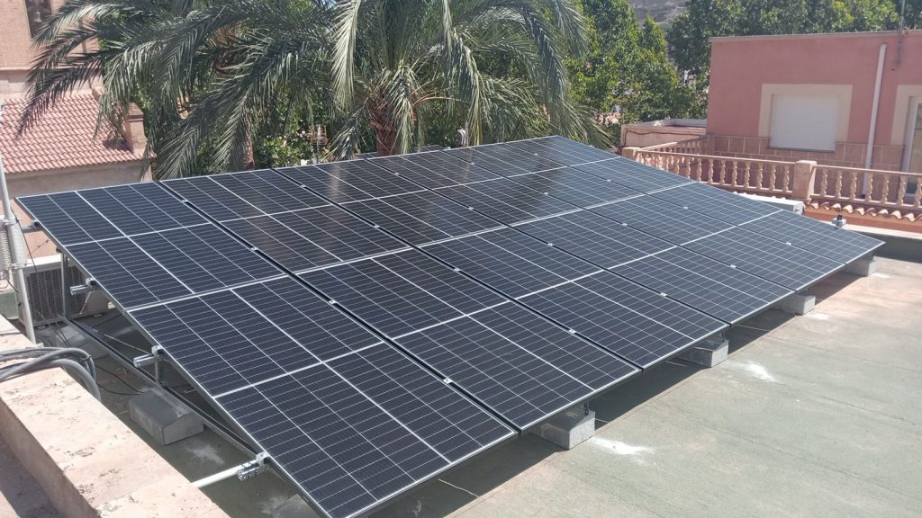 Hemos instalado 50 paneles solares que distribuirán la energía al Ayuntamiento, el colegio, el club de la tercera edad y el salón de usos múltiples. Todos ellos se han colocado sobre cubiertas planas, con estructura metálica inclinada de aluminio y lastrada mediante bordillos y cables de acero.