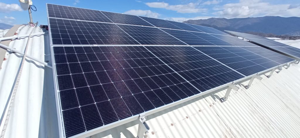 Las placas, divididas en dos strings de nueve unidades cada una, se montaron sobre una nave multi túnel con perfiles regulables de aluminio y en un mismo plano para garantizar una producción homogénea. La línea de corriente continua está protegida por sobretensiones y fusibles, mientras que la línea de evacuación del inversor cuenta con protección magnetotérmica y diferencial.